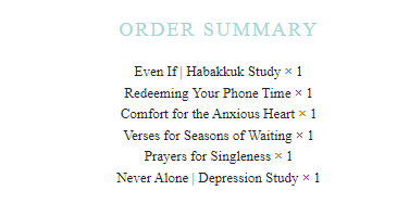 Looking back at my confirmation emails, I ordered the following devotions and bible studies: